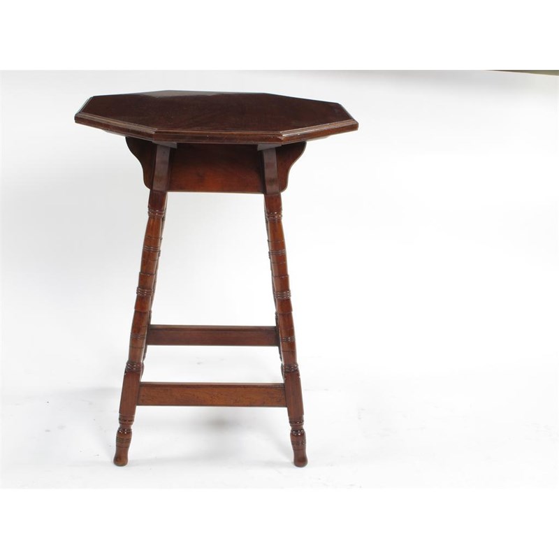An Arts and Crafts table, possibly retailed by Liberty & Co, turned wooden legs supporting octagonal table top unsigned 66cm. high, 53cm. wide