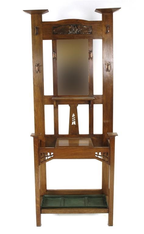 An Arts and Crafts oak hall stand, in the manner of Shapland & Petter, with pierced foliate panels, inset with a copper galleon plaque unsigned 199cm. hgih