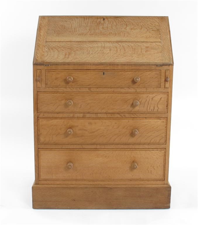 A Heal's weathered oak bureau, four drawer form, with turned oak handles, inset ivorine label 104.5cm. high, 73.5cm. wide
