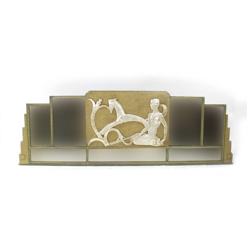 A large Art Deco mirror probably Rowley Gallery, the central silvered gesso panel of a nude woman kneeling beside a horse unsigned 210cm. wide, 72cm. high