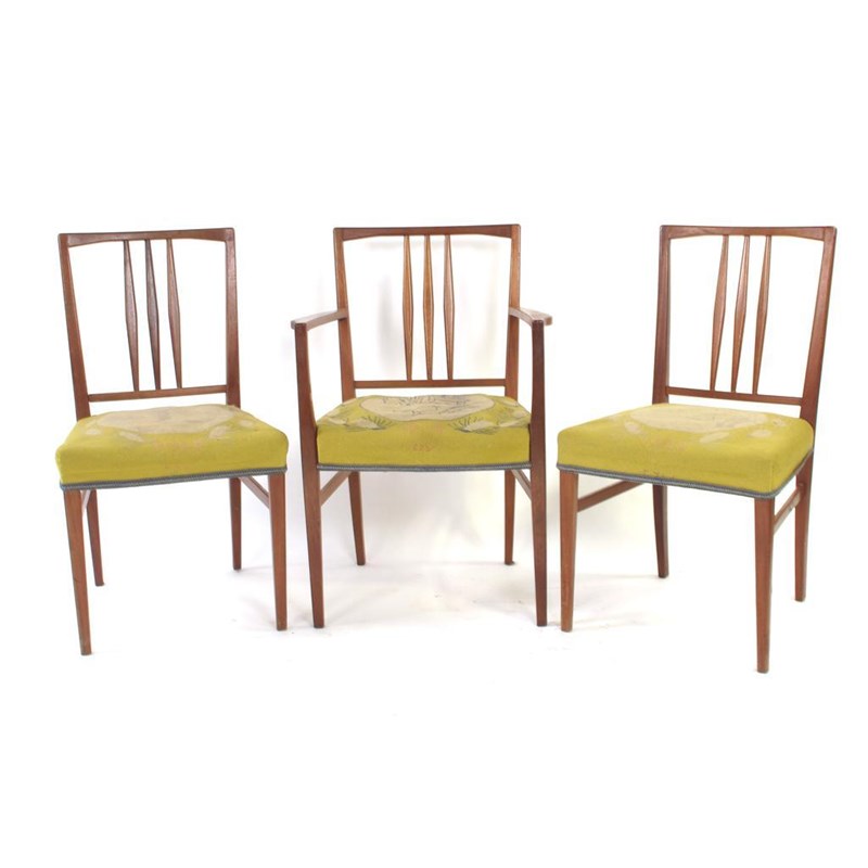 A set of eight Gordon Russell teak chairs, designed by W.H. Russell, with embroidered seats, unsigned 86cm. high