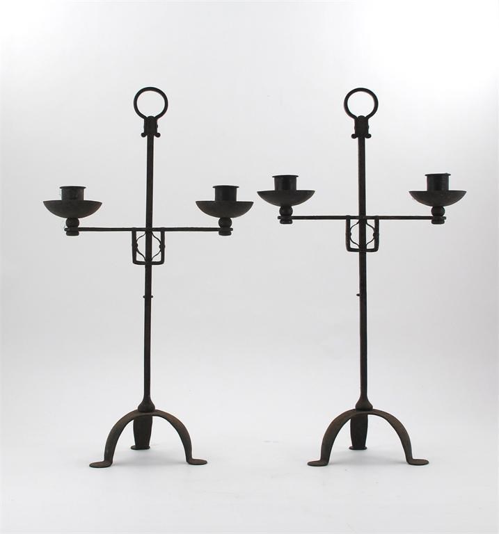 A pair of Arts and Crafts iron electric candlesticks, on shallow tripod foot, twin branch form unsigned 54.5cm. high