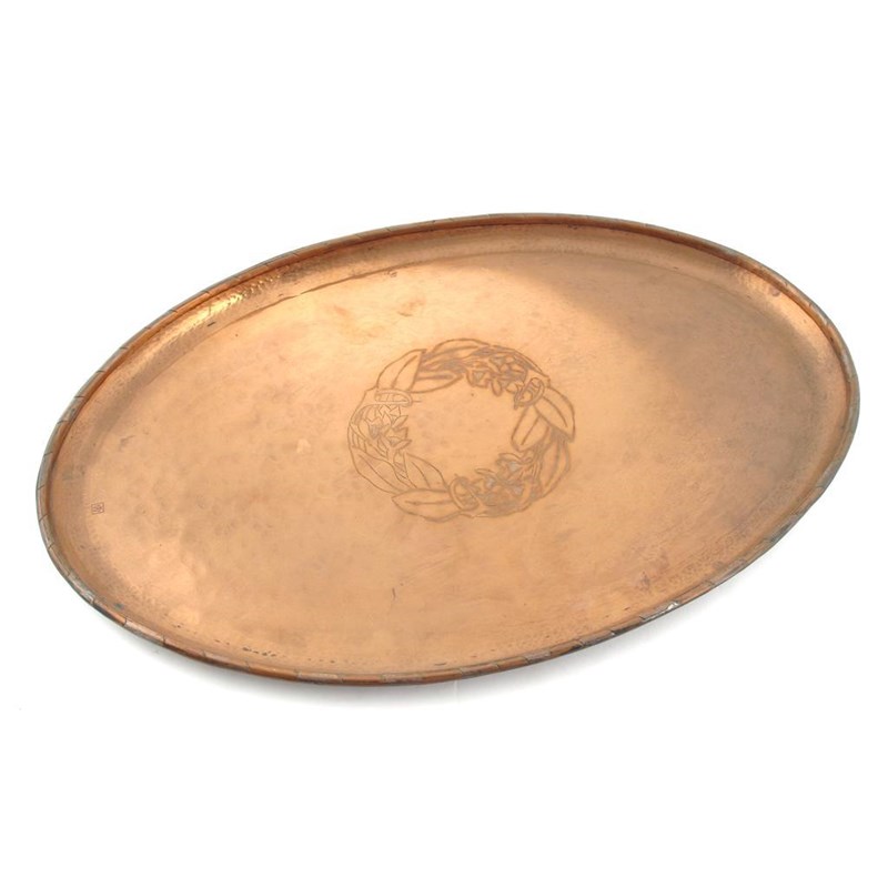 A Hugh Wallis copper tray, elliptical form, the well etched with entwined flower wreath, and three other Hugh Wallis trays, stamped marks to all four main 50cm. wide
