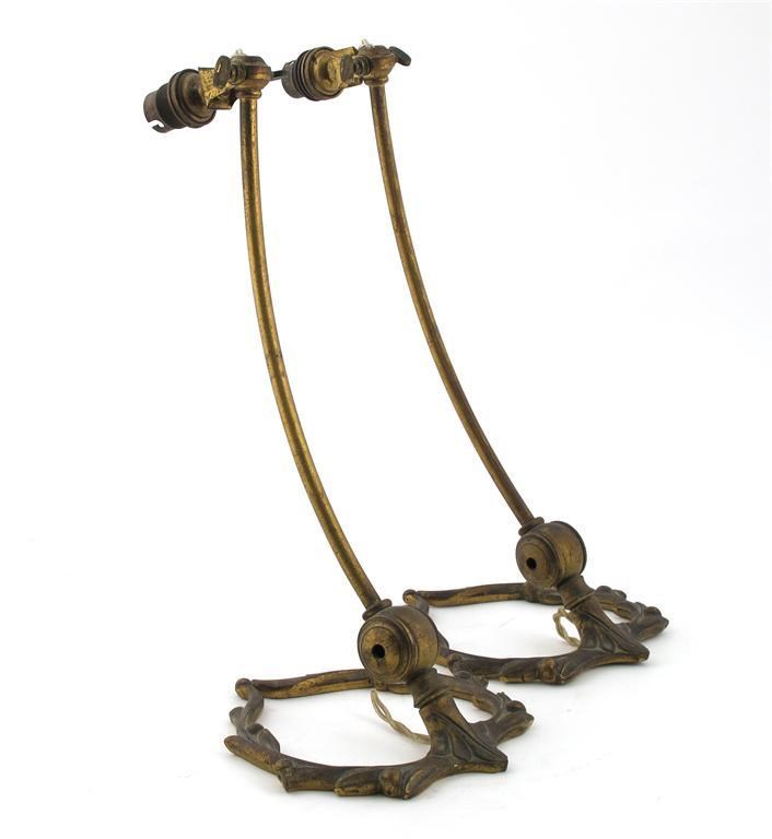 A pair of W.A.S Benson gilded brass wall/desk lights, the cast foot rim supporting curved stem and adjustable fitting, unsigned 37cm. high
