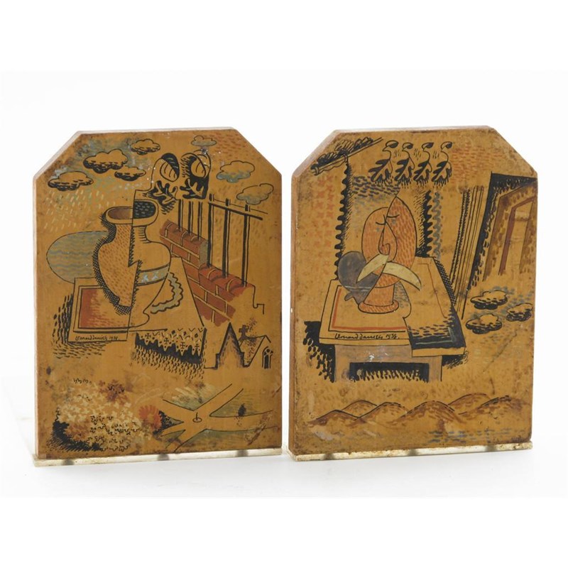 A pair of wood book ends by Leonard Daniels, dated 1938, decorated with Surrealist landscapes signed and dated 16cm. high
