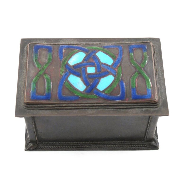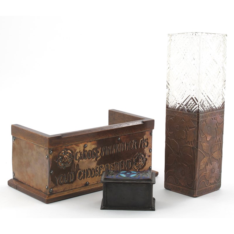 An Arts and crafts copper casket with hinged cover, the cover with Celtic entrelac enamelled in green and blue, a book shelf, and a copper mounted glass vase unsigned casket 10.5cm. wide