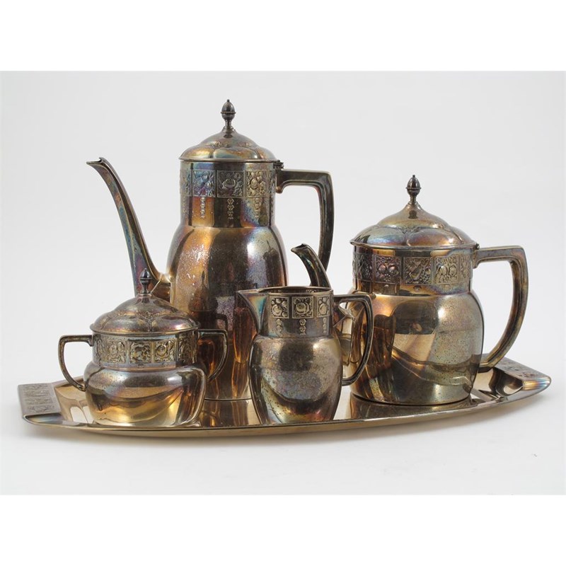 An electroplated metal four piece service, comprising coffee pot and hinged cover, tea pot and hinged cover, milk-jug and sugar basin with cover, on tray, cast in low relief with panels of fruit and foliage stamped with numbers tray 44cm. wide