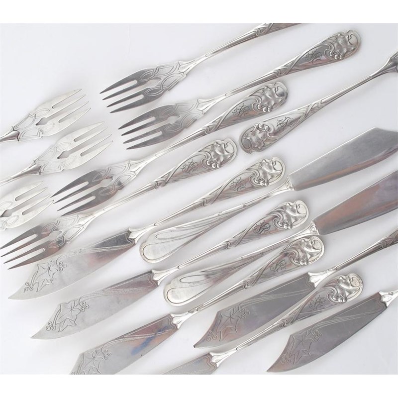 A set of Art Nouveau electroplated fish forks and knives, cast in low relief with ivy leaves, stamped marks