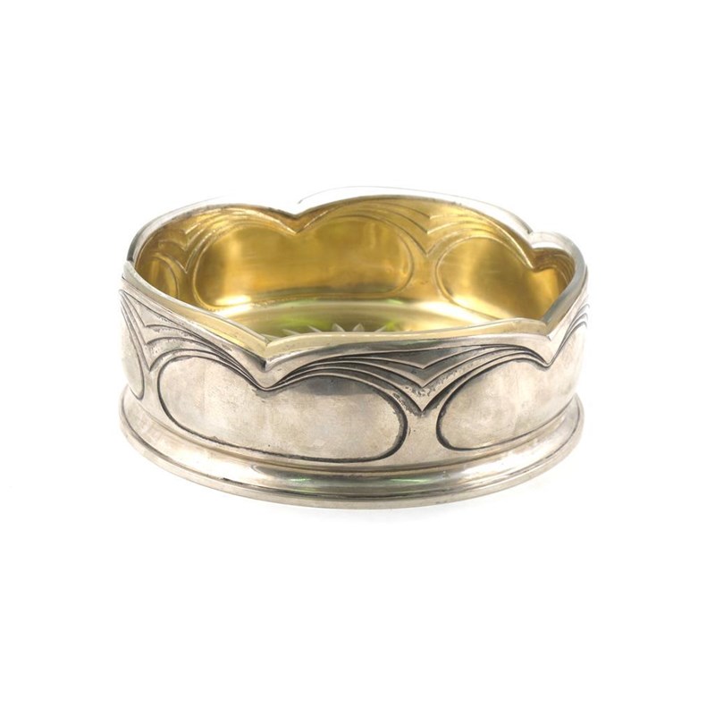 A Peter Bruckmann Secessionist silver bowl with glass liner, circular, cast in low relief with abstracted foliate design stamped marks 19cm. diam.