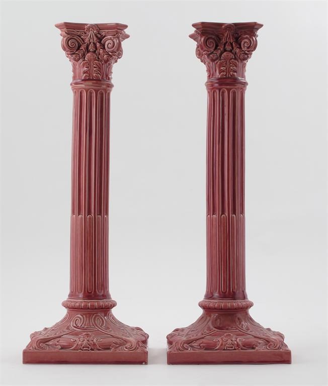 A tall pair of Burmantoft's Faience candlesticks, Corinthian pillar form, glazed red impressed marks, restored 45cm. high