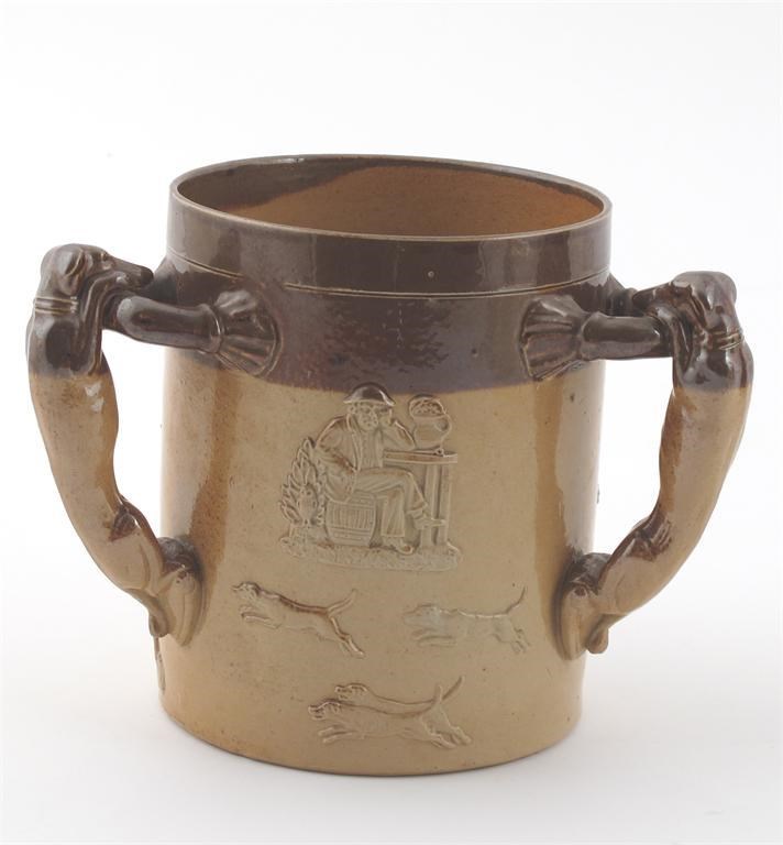 A Doulton Lambeth stoneware tyg, modelled in low relief with drinking and hunting scenes, the handles each modelled as a hound impressed marks 14cm. high