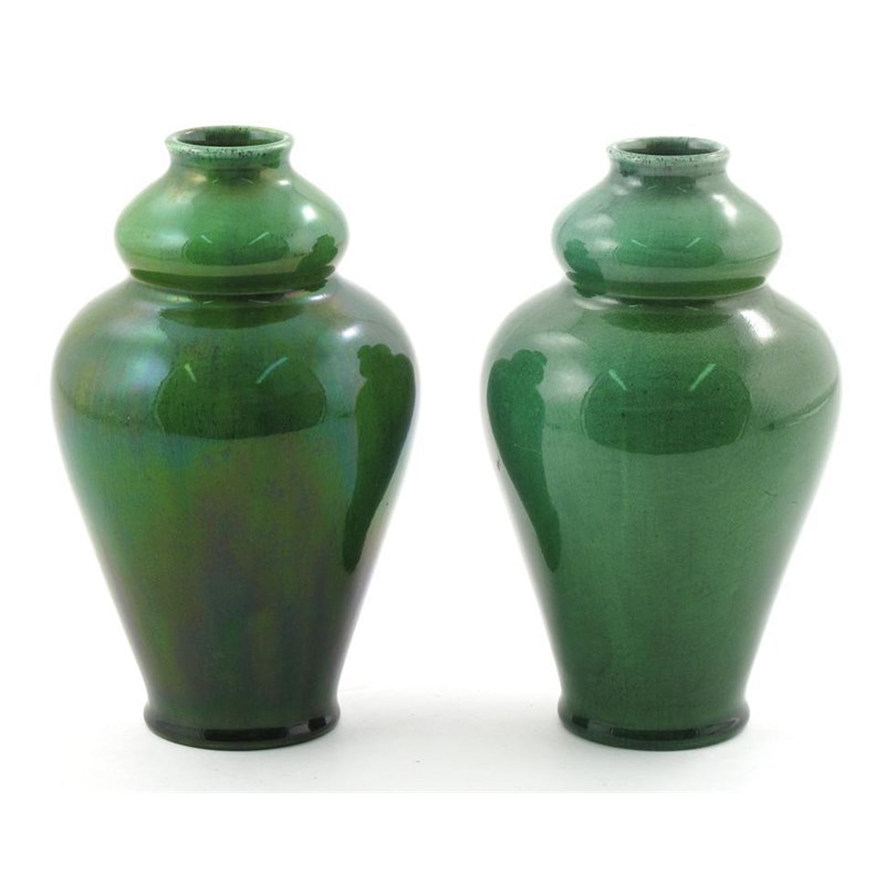 A pair of Pilkington's Lancastrian vases, shouldered form with knopped necks, covered in a streaked green glaze with aventurine inclusions printed bee mark, small chip to rim of one 17.5cm. high