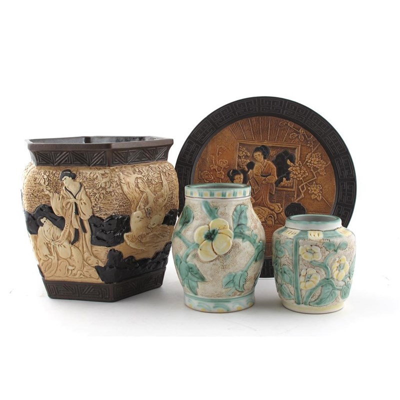 A Bretby Pottery jardiniere, cast in low relief with oriental figures in a landscape, a Bretby charger, and two Denby Danesby Ware vases impressed marks, jardiniere 26cm. high