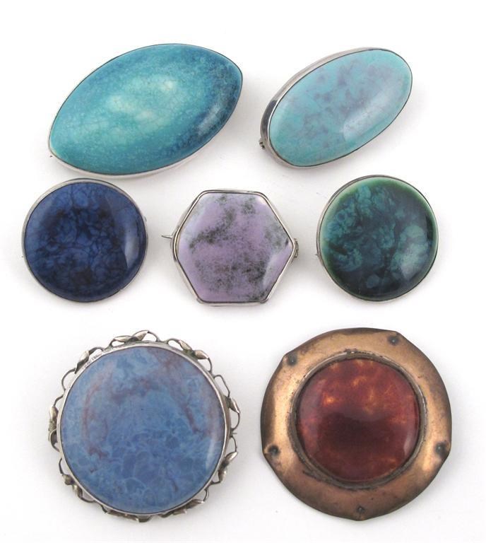 Six Ruskin Pottery stoneware brooches, each with metal mount, and an Arts and Crafts enamelled copper brooch stamped Ruskin marks, largest 4.5cm. long