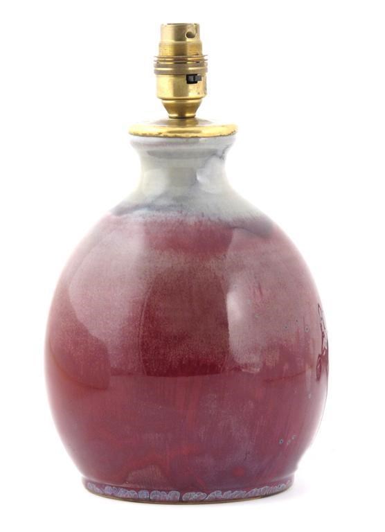 A Ruskin High-fired stoneware lamp base, ovoid form, sang de boeuf, with sliver grey neck, speckled with mint impressed marks, facsimile signature dated 1936 22cm. high