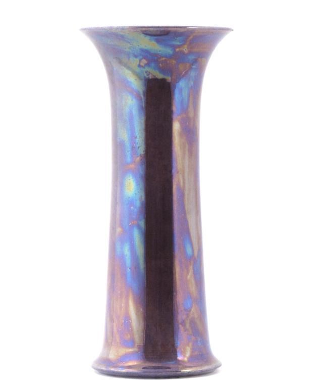 A tall Ruskin Pottery stoneware vase, cylindrical form with flaring neck, covered in a purple lustre glaze impressed mark, dated 1920 36cm. high