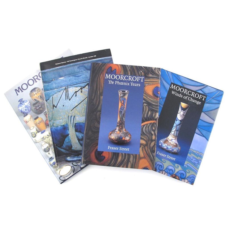 A collection of six Moorcroft Pottery reference books, including; Moorcroft Pottery, Richard Dennis catalogue, Two Moorcroft books by Paul Atterbury, The Phoenix Years and Winds of Change by Fraser Street, and a promotional video by Moorcroft and a Christie's Moorcroft Pottery poster