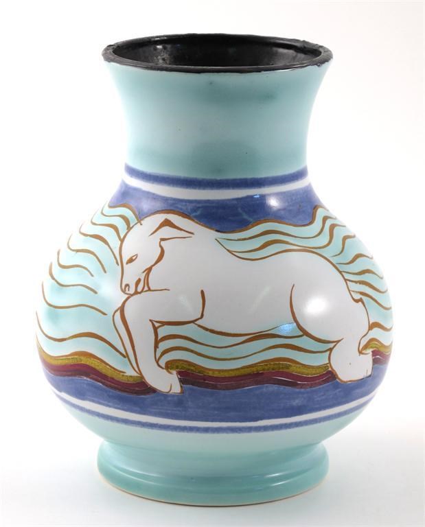 'Inspiration' a Clarice Cliff Bizarre vase shape 774, painted with a galloping horse, in colours printed factory mark 21cm. high
