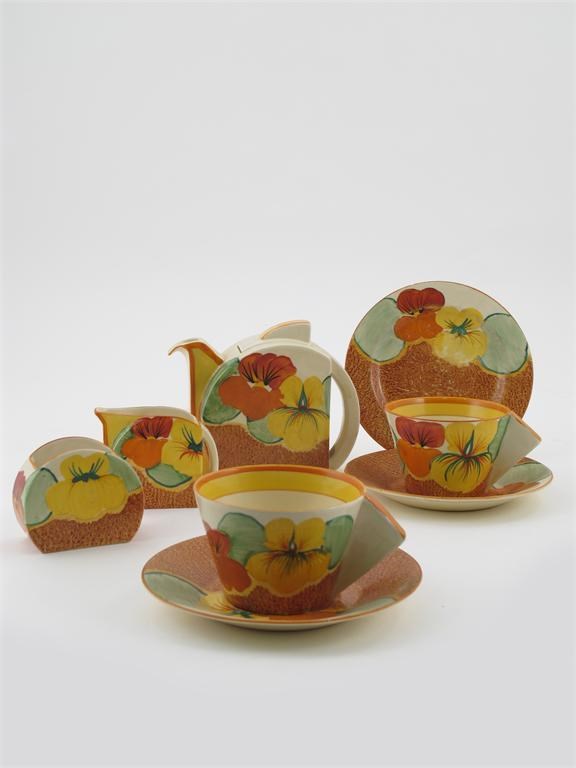'Nasturtium' a Clarice Cliff Bizarre Stamford tea for two, painted in colours, comprising; teapot and cover, milk-jug and sugar basin, two cups, saucers and a side plate printed factory marks, small chips to side plate and one saucer, teapot 12cm. high