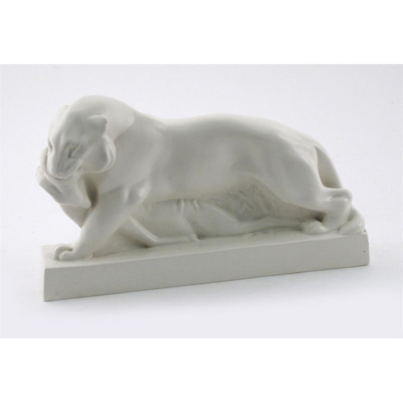'Tiger and Buck' a Wedgwood Pottery figure group, designed by John Skeaping, covered in a matt white glaze impressed and printed marks, small bruise to base, 33.5cm. wide