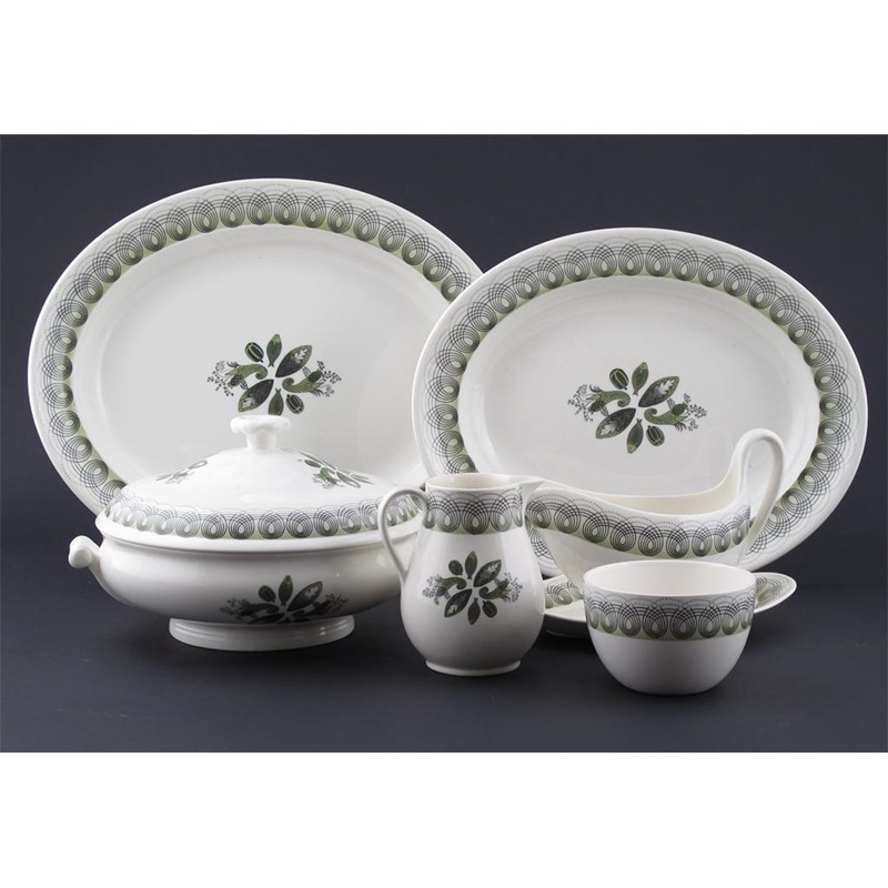 'Persephone' a Wedgwood service designed by Eric Ravilious, printed with vignettes on a green ground, comprising; two tureens and covers, two graduated platters, a sauce boat and tray, six dinner, eight entree plates, nine bowls, milk-jug, sugar basin, two cups, four saucers and ten side plates printed marks
