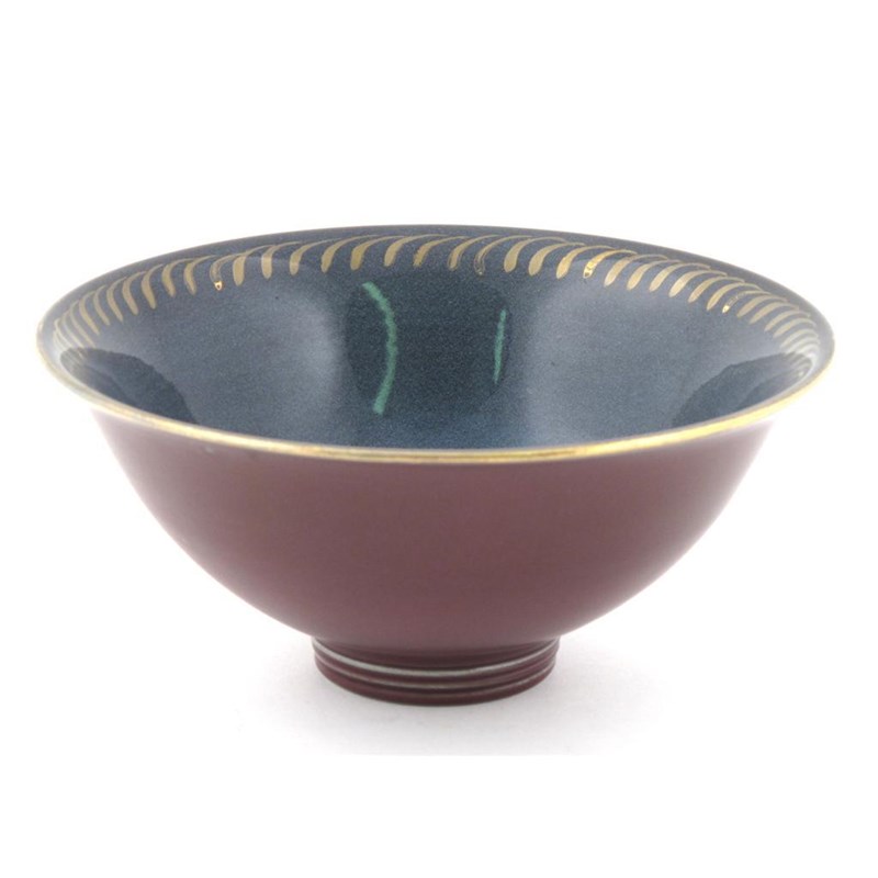 A Wedgwood bowl by Norman Wilson, the exterior glazed burgundy, the interior mottled blue with silver dash rim and flower stem impressed marks, NM mark 20cm. diam.