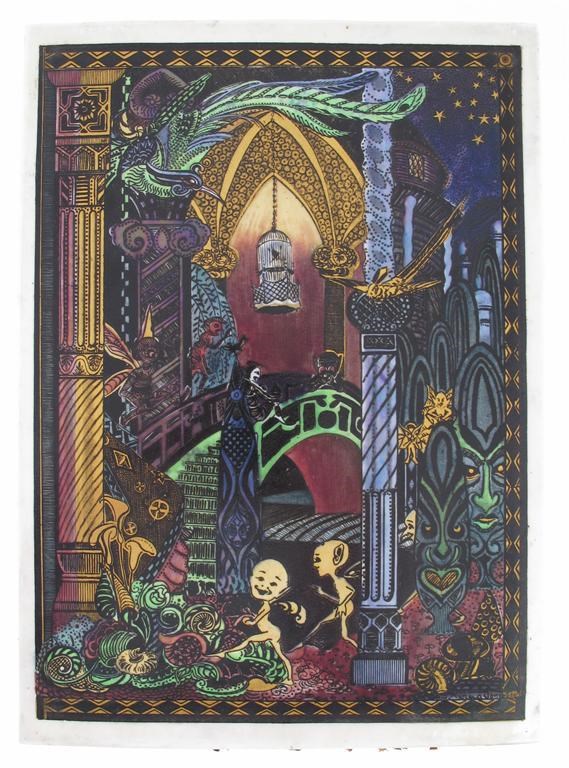 'Elfin Palace' a rare Wedgwood Fairyland lustre plaque, designed by Daisy Makeig-Jones, rectangular printed and painted in colours and gilt, in original wooden frame, printed mark to reverse, facsimile signature and date 20 to the front 27 x 20cm.