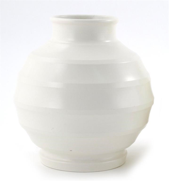 A Wedgwood earthenware vase, designed by Keith Murray, faceted ovoid form with collar neck, covered in a Matt White glaze printed mark and facsimile signature 19cm. high