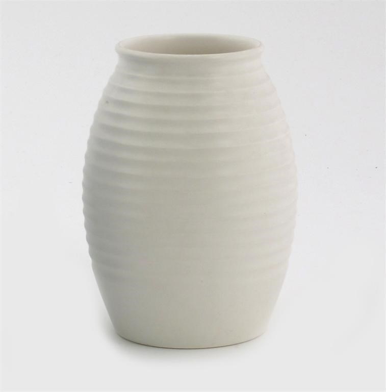 A Wedgwood earthenware vase, designed by Keith Murray, ribbed, barrel form covered in a Moonstone glaze printed mark KM monogram 14cm. high