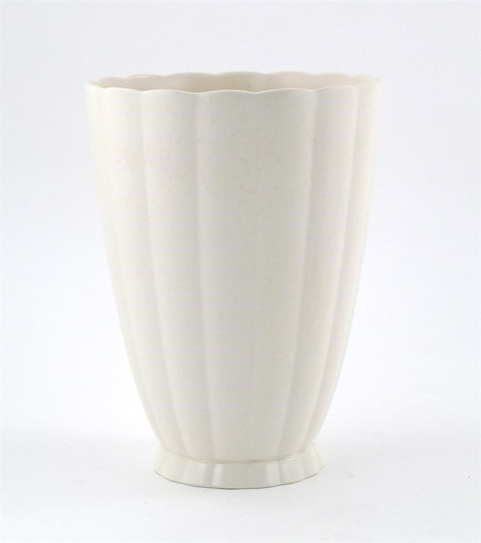 A Wedgwood earthenware vase, designed by Keith Murray, fluted form on shallow foot, covered in a matt white glaze printed mark, facsimile signature 23.5cm. high