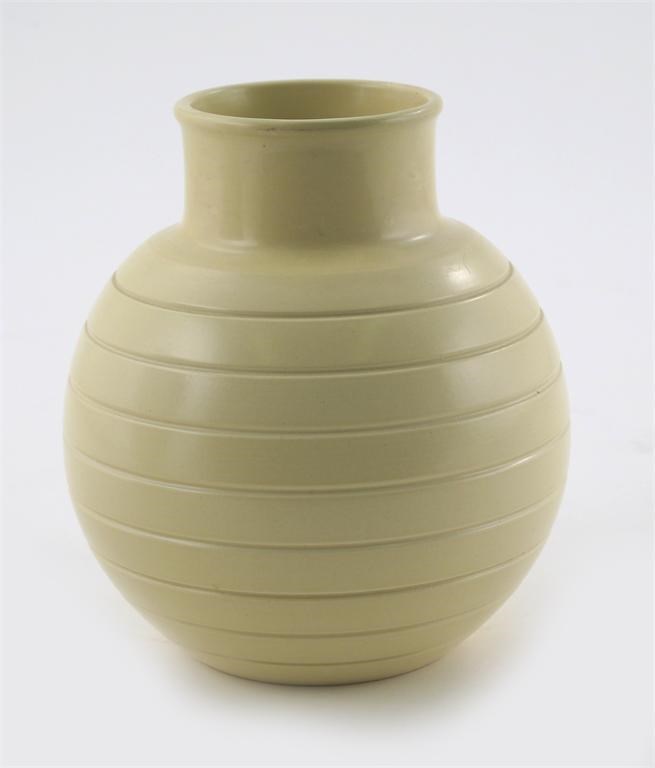A Wedgwood earthenware vase, designed by Keith Murray, ribbed, ovoid form with collar rim, covered in a Matt Straw glaze printed mark and facsimile signature 15.5cm. high