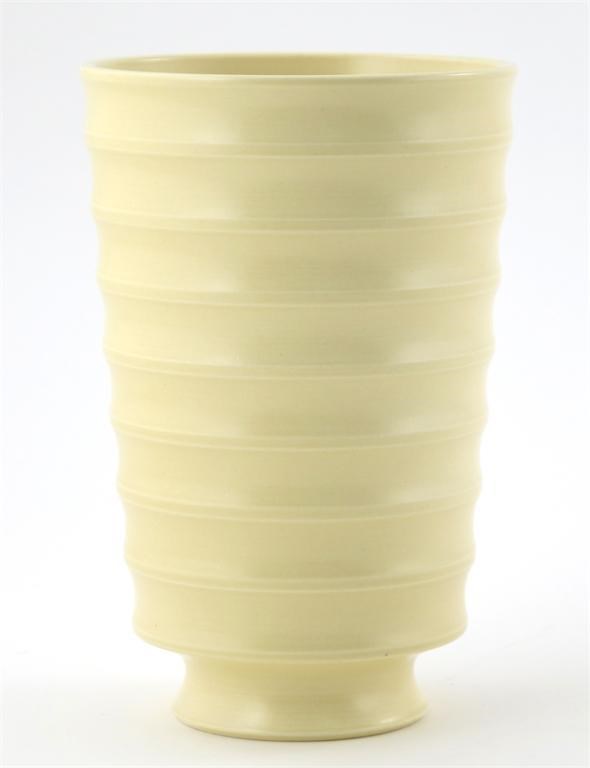 A Wedgwood earthenware vase, designed by Keith Murray, ribbed cylindrical form on shallow foot printed mark KM monogram 19cm. high