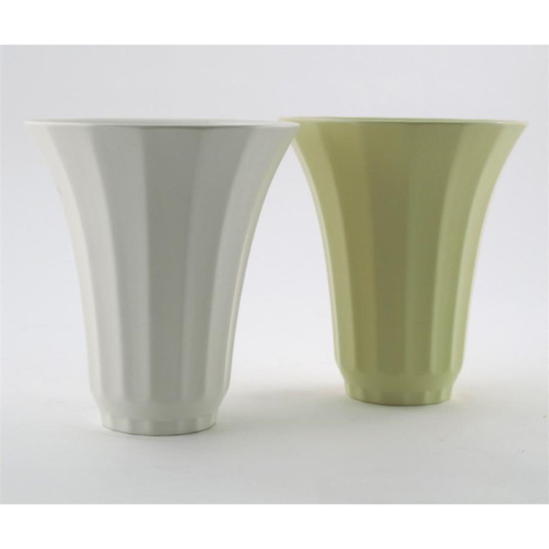 A Wedgwood earthenware vase, designed by Keith Murray, shape 3808, flaring, fluted form glazed in a Matt Straw glaze, and another glazed Matt White, printed mark and facsimile signature 19cm. high