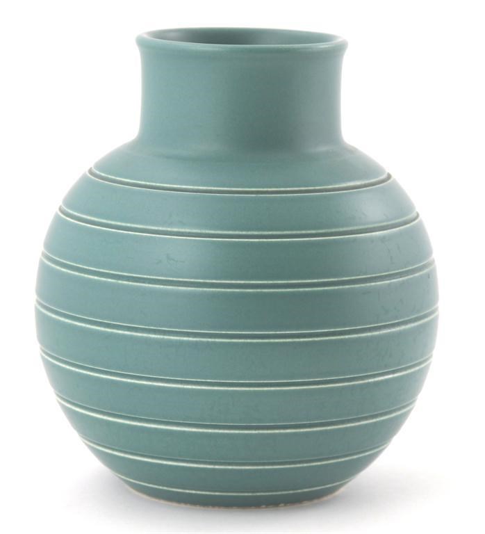 A Wedgwood earthenware vase, designed by Keith Murray, ribbed ovoid form with collar rim, covered in a Matt Green glaze printed mark, facsimile signature 16cm. high