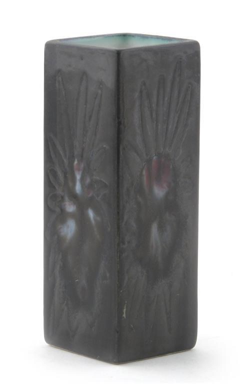 A Troika Pottery vase, square section, covered in a black glaze with resist decorated flowerhead design painted mark 11.5cm. high