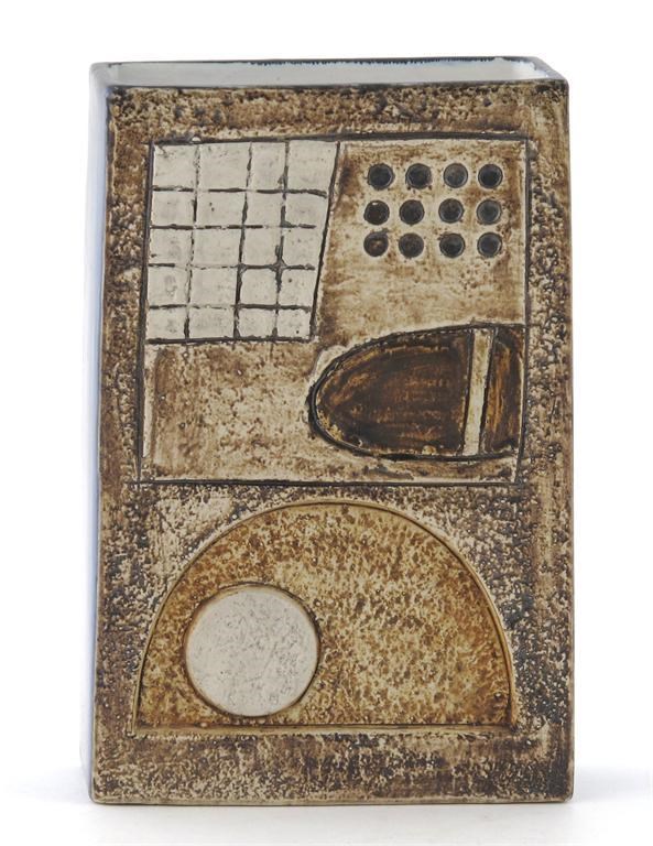 A Troika Pottery vase, slab form, modelled in low relief with geometric panels, in shades of ochre and blue painted marks, 17.5cm. high