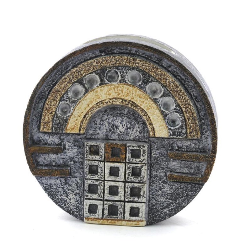 A Troika Pottery Wheel vase, modelled in low relief with geometric panels, glazed ochre and blue painted marks LJ monogram 16cm. high