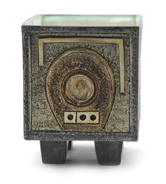A Troika Pottery cube vase, on square feet, modelled in low relief with geometric panels, in shades of ochre and blue, the feet glazed bronze painted mark, re-sprayed panel to interior 18cm. high