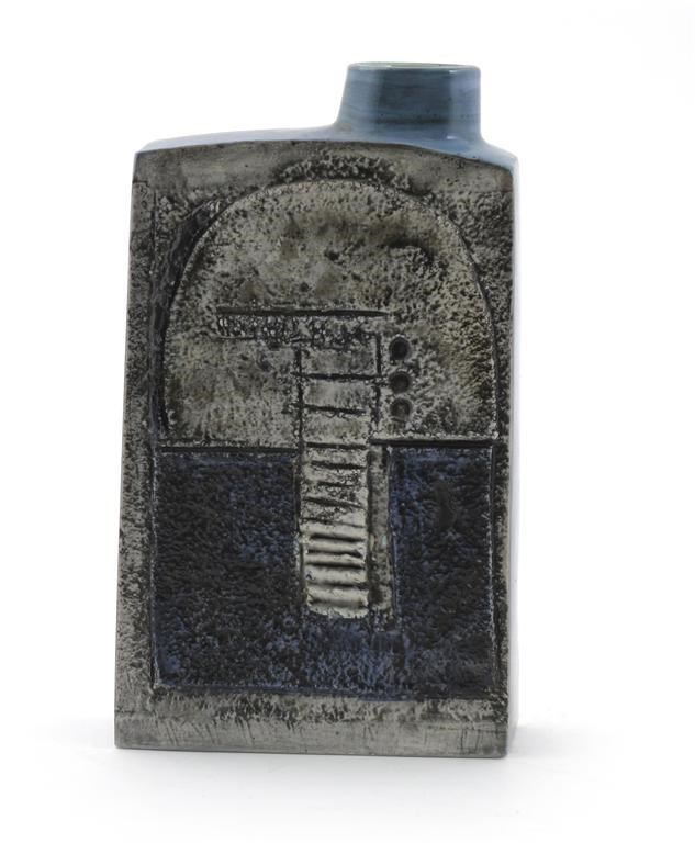 A Troika Pottery Chimney vase, modelled in low relief with geometric panels, glazed ochre and blue painted marks 20cm. high