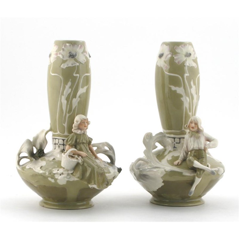 A pair of Art Nouveau Royal Dux vases, compressed form, each modelled with figures resting beside flowers, in colours applied pink triangle mark 25cm. high
