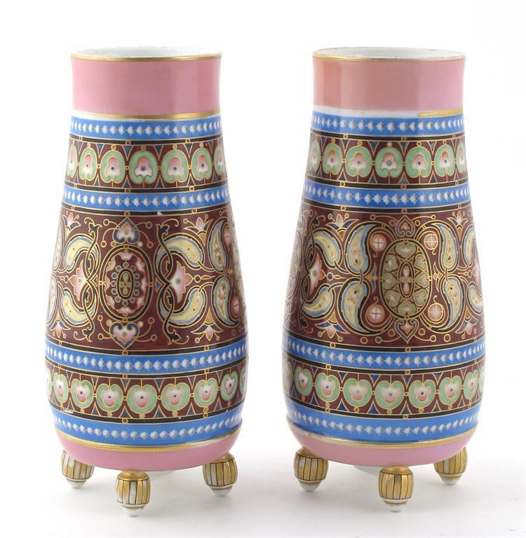 A pair of Sevres vases, the decoration in the manner of Dr Christopher Dresser, tapering cylindrical form on barrel feet, painted with stylised flowers and foliage in colours painted mark 26cm. high