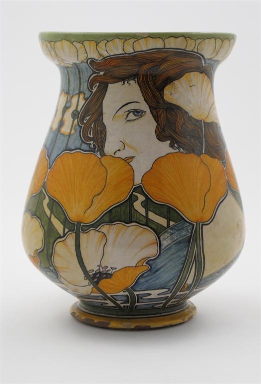 An Art Nouveau Arte Della Ceramica, Chini & Co pottery vase, probably designed by Galileo Chini, painted with a maiden before orange opium poppies, a distant landscape with long and winding road, in colours impressed mark, repaired chip to side, minor glaze frits 26cm.high