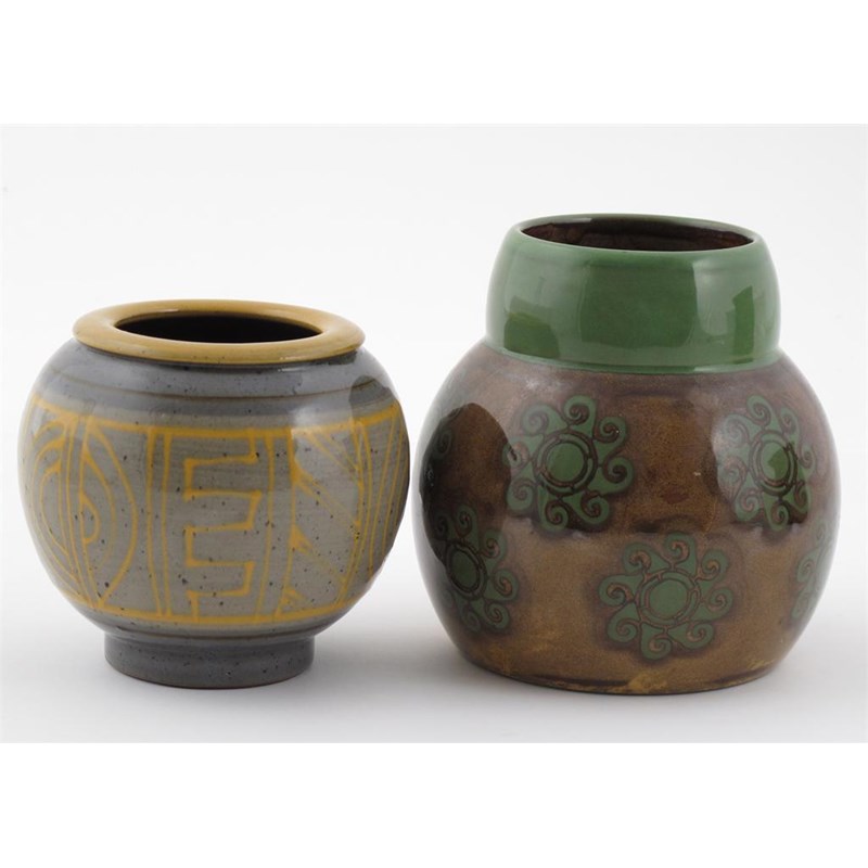 A Wachtersbacher Steingutfabrik pottery vase the design attributed to Christian Neureuther, stencil decorated with geometric roundel and another vase, impressed and printed marks 13.5cm. high