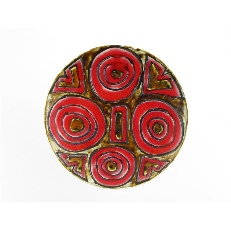 A Poole Pottery Studio side plate decorated in resist with a geometric design in red, black and ochre, two other Poole Delphis items and a vase printed marks 20.5cm. diam.