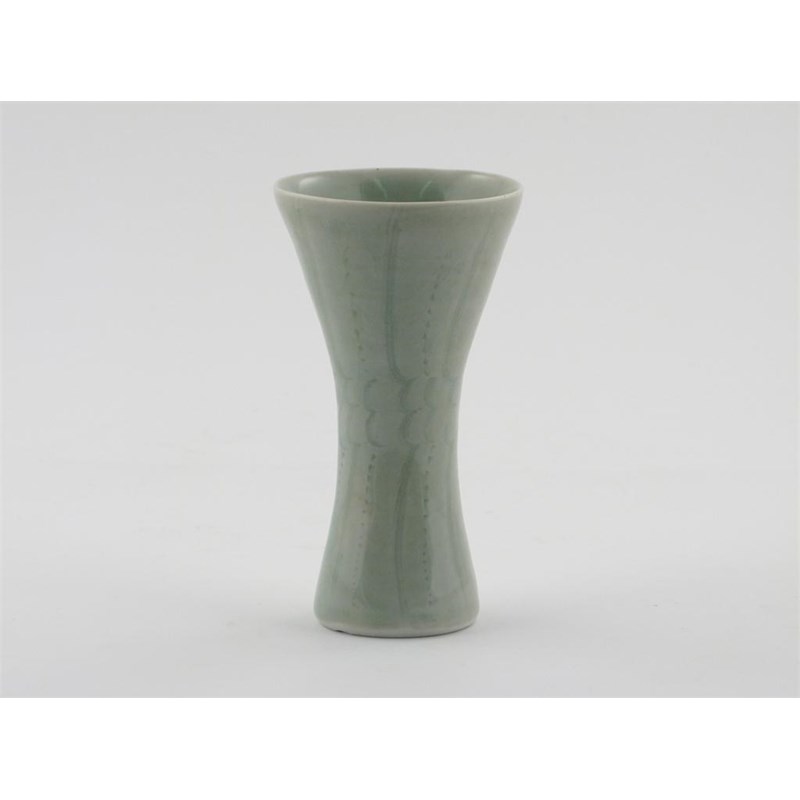 a Lowerdown Pottery porcelain vase, waisted form, covered in a Y-Ching celadon glaze impressed seal mark 13cm. high