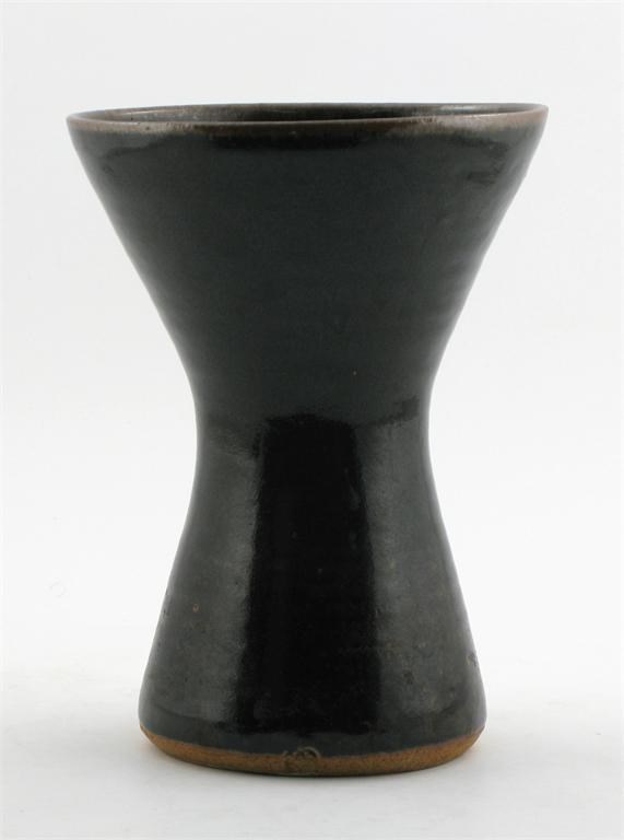 a waisted stoneware vase, covered to the foot with a tenmoku glaze impressed seal mark 24cm. high