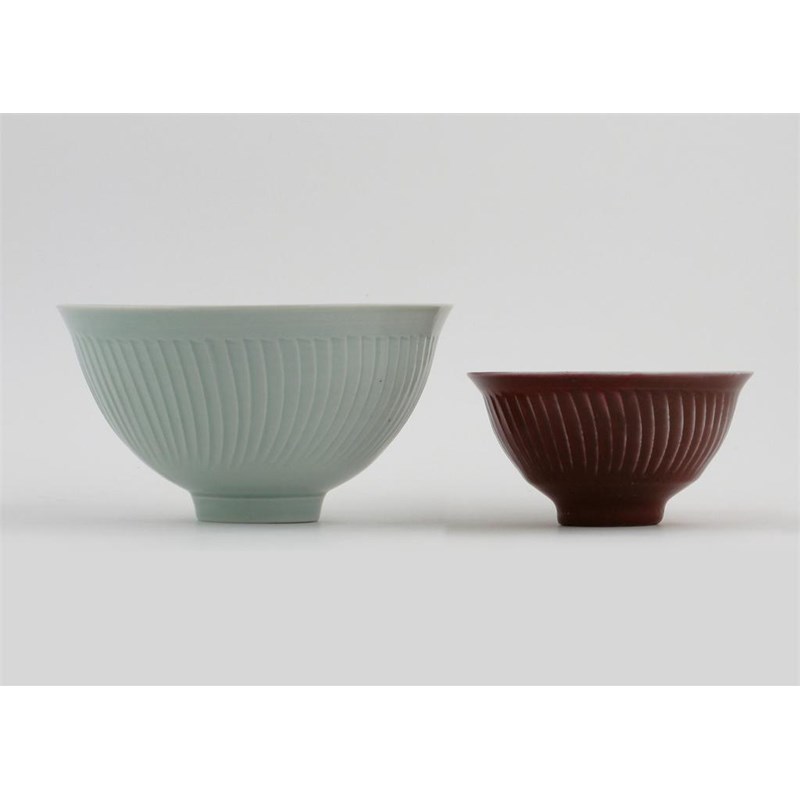 a cut-sided porcelain bowl covered in a copper red reduction glaze, and a David Leach Y-Ching celadon glaze bowl impressed seal marks 12.5cm. diam.