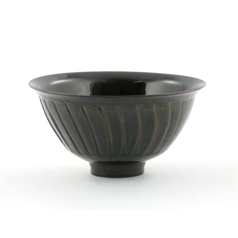 a cut sided porcelain bowl, covered in a gun-metal glaze impressed seal mark, 19cm. diam.