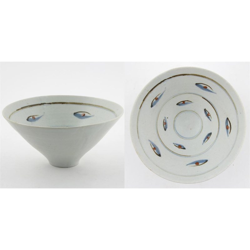 a Lowerdown Pottery porcelain flaring bowl, decorated to the interior with stylised fish in copper red and blue impressed seal mark 17cm. diam.