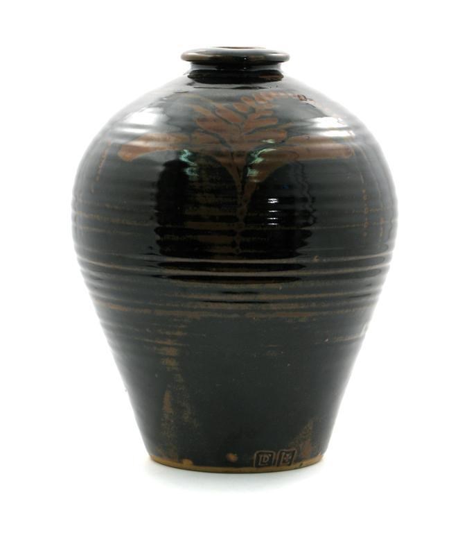 a tall Lowerdown Pottery stoneware vase, shouldered form, painted in rust with foxglove sprays on tenmoku impressed seal marks 34cm. high